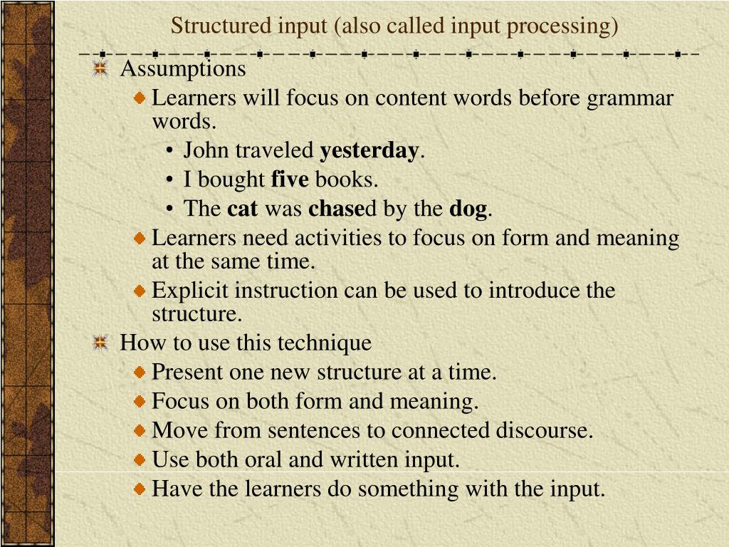 Structured input (also called input processing) • Assumptions • Learners will focus on content words before grammar words. • John traveled yesterday. • I bought five books. • The cat was chased by the dog. • Learners need activities to focus on form and meaning at the same time. • Explicit instruction can be used to introduce the structure. • How to use this technique • Present one new structure at a time. • Focus on both form and meaning. • Move from sentences to connected discourse. • Use both oral and written input. • Have the learners do something with the input.