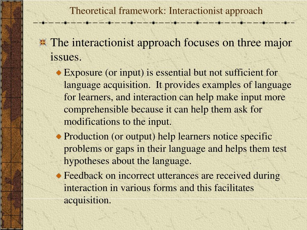 Theoretical framework: Interactionist approach • The interactionist approach focuses on three major issues. • Exposure (or input) is essential but not sufficient for language acquisition. It provides examples of language for learners, and interaction can help make input more comprehensible because it can help them ask for modifications to the input. • Production (or output) help learners notice specific problems or gaps in their language and helps them test hypotheses about the language. • Feedback on incorrect utterances are received during interaction in various forms and this facilitates acquisition.