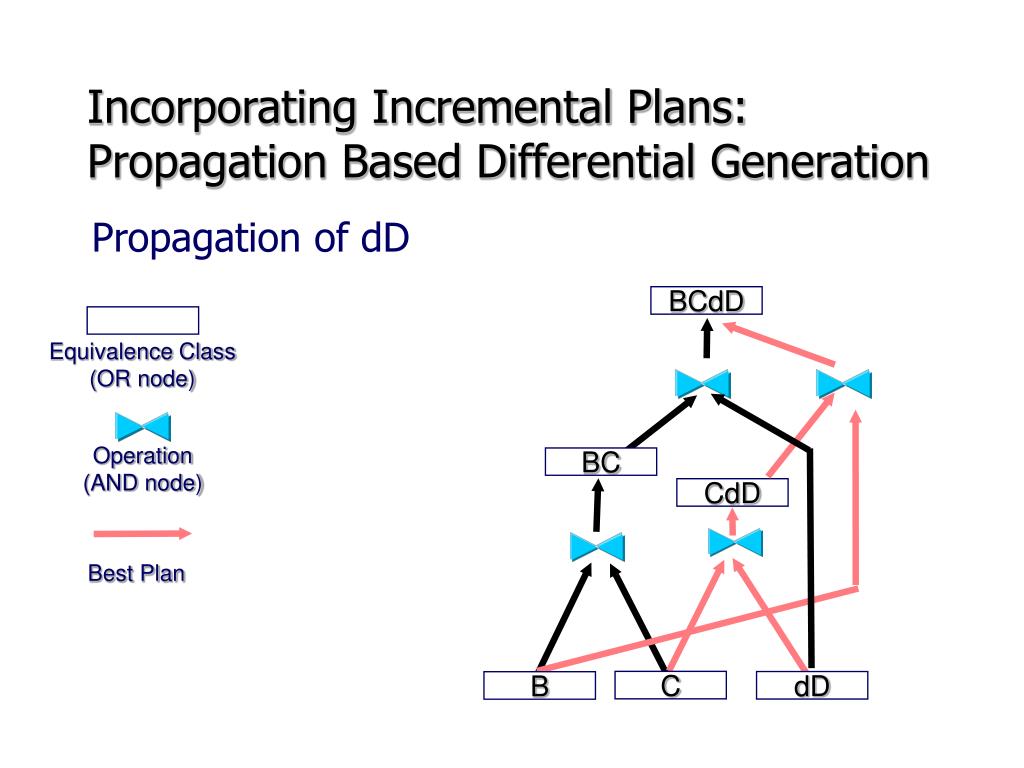 Incorporating Incremental Plans:Propagation Based Differential Generation Propagation of dD BCdD Equivalence Class (OR node) Operation (AND node) BC CdD Best Plan C dD B