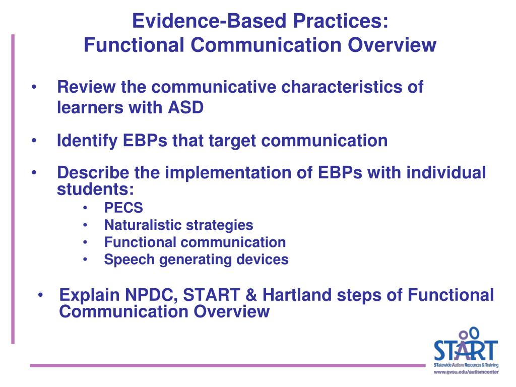 Evidence-Based Practices: Functional Communication Overview Review the communicative characteristics of learners with ASD Identify EBPs that target communication Describe the implementation of EBPs with individual students: PECS Naturalistic strategies Functional communication Speech generating devices Explain NPDC, START & Hartland steps of Functional Communication Overview