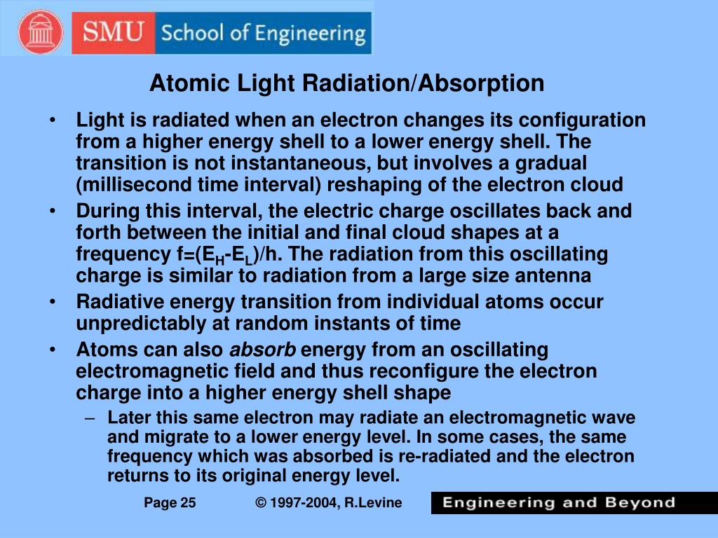 Atomic Light Radiation/Absorption • Light is radiated when an electron changes its configuration from a higher energy shell to a lower energy shell. The transition is not instantaneous, but involves a gradual (millisecond time interval) reshaping of the electron cloud • During this interval, the electric charge oscillates back and forth between the initial and final cloud shapes at a frequency f=(EH-EL)/h. The radiation from this oscillating charge is similar to radiation from a large size antenna • Radiative energy transition from individual atoms occur unpredictably at random instants of time • Atoms can also absorb energy from an oscillating electromagnetic field and thus reconfigure the electron charge into a higher energy shell shape • Later this same electron may radiate an electromagnetic wave and migrate to a lower energy level. In some cases, the same frequency which was absorbed is re-radiated and the electron returns to its original energy level. © 1997-2004, R.Levine