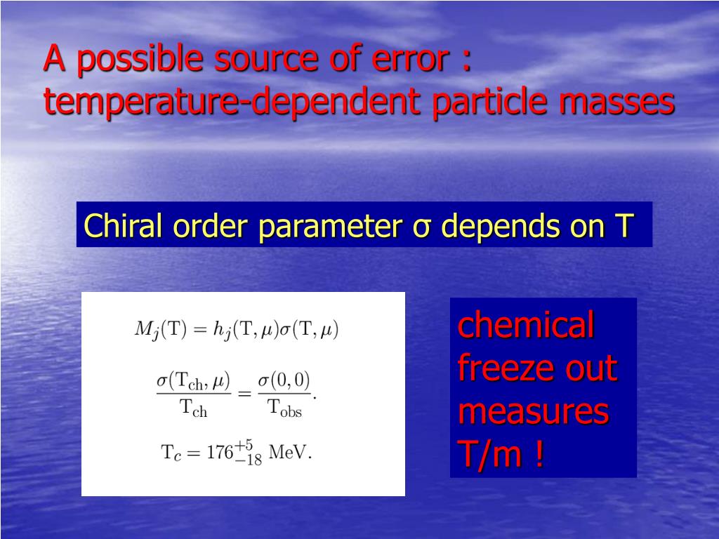A possible source of error : temperature-dependent particle masses Chiral order parameter σ depends on T chemical freeze out measures T/m !