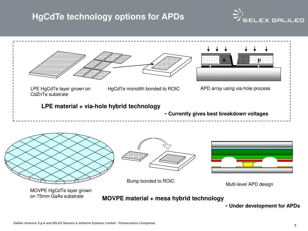 HgCdTe technology options for APDs n p APD array using via-hole process LPE HgCdTe layer grown on CdZnTe substrate HgCdTe monolith bonded to ROIC LPE material + via-hole hybrid technology - Currently gives best breakdown voltages Bump bonded to ROIC Multi-level APD design MOVPE HgCdTe layer grown on 75mm GaAs substrate MOVPE material + mesa hybrid technology - Under development for APDs