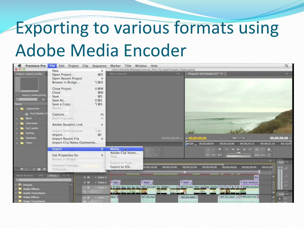import video and audio • Using the Media Browser you can import files from computer sources in any of the leading media formats. Each file you capture or import automatically becomes a clip in the Project panel. • File --- Import ---Browse –select the video or audio