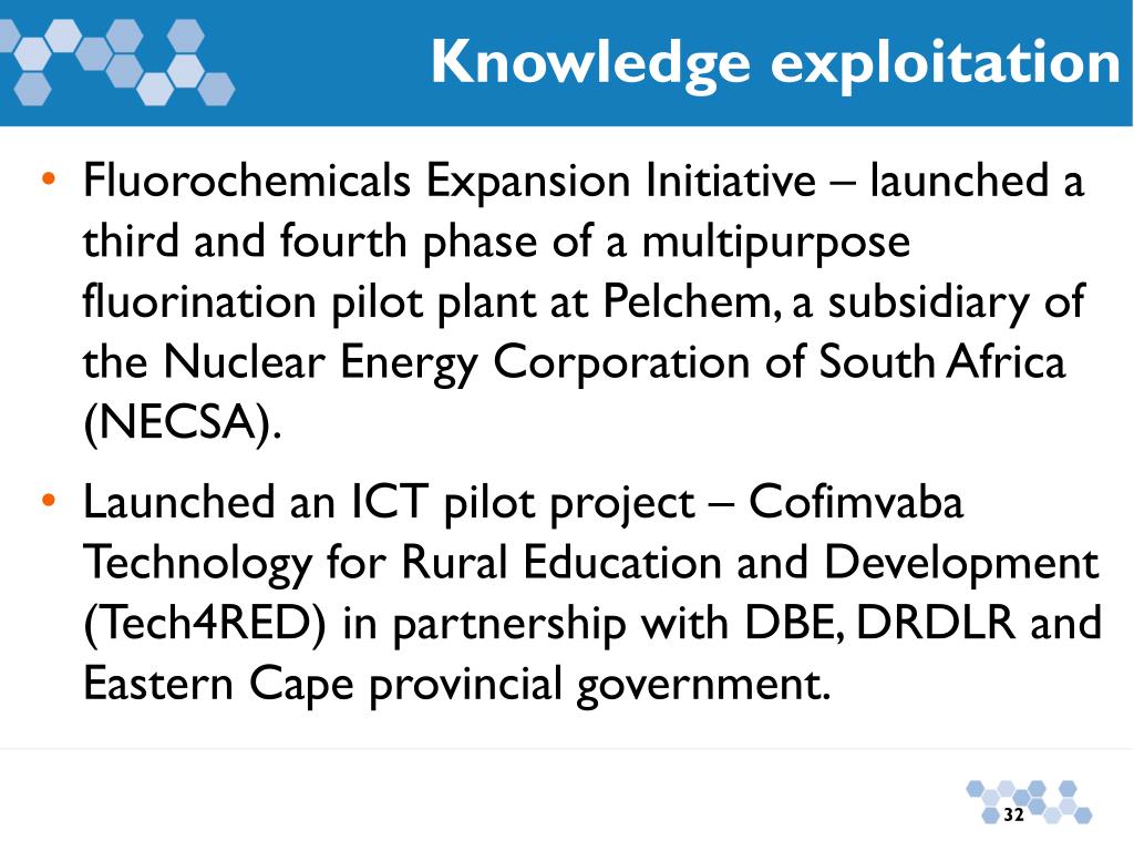 Knowledge exploitation • Fluorochemicals Expansion Initiative – launched a third and fourth phase of a multipurpose fluorination pilot plant at Pelchem, a subsidiary of the Nuclear Energy Corporation of South Africa (NECSA). • Launched an ICT pilot project – Cofimvaba Technology for Rural Education and Development (Tech4RED) in partnership with DBE, DRDLR and Eastern Cape provincial government.
