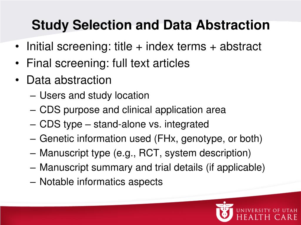 Study Selection and Data Abstraction • Initial screening: title + index terms + abstract • Final screening: full text articles • Data abstraction • Users and study location • CDS purpose and clinical application area • CDS type – stand-alone vs. integrated • Genetic information used (FHx, genotype, or both) • Manuscript type (e.g., RCT, system description) • Manuscript summary and trial details (if applicable) • Notable informatics aspects