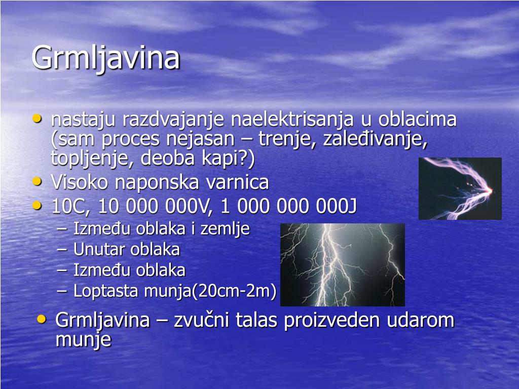 Grmljavina • nastaju razdvajanje naelektrisanja u oblacima (sam proces nejasan – trenje, zaleđivanje, topljenje, deoba kapi?) • Visoko naponska varnica • 10C, 10 000 000V, 1 000 000 000J • Između oblaka i zemlje • Unutar oblaka • Između oblaka • Loptasta munja(20cm-2m) • Grmljavina – zvučni talas proizveden udarom munje