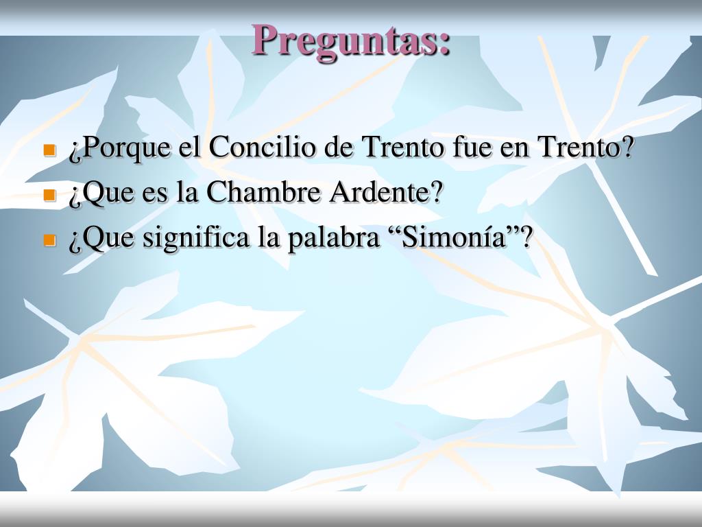 Preguntas: • ¿Porqueel Concilio de Trento fue en Trento? • ¿Quees la Chambre Ardente? • ¿Que significa la palabra “Simonía”?