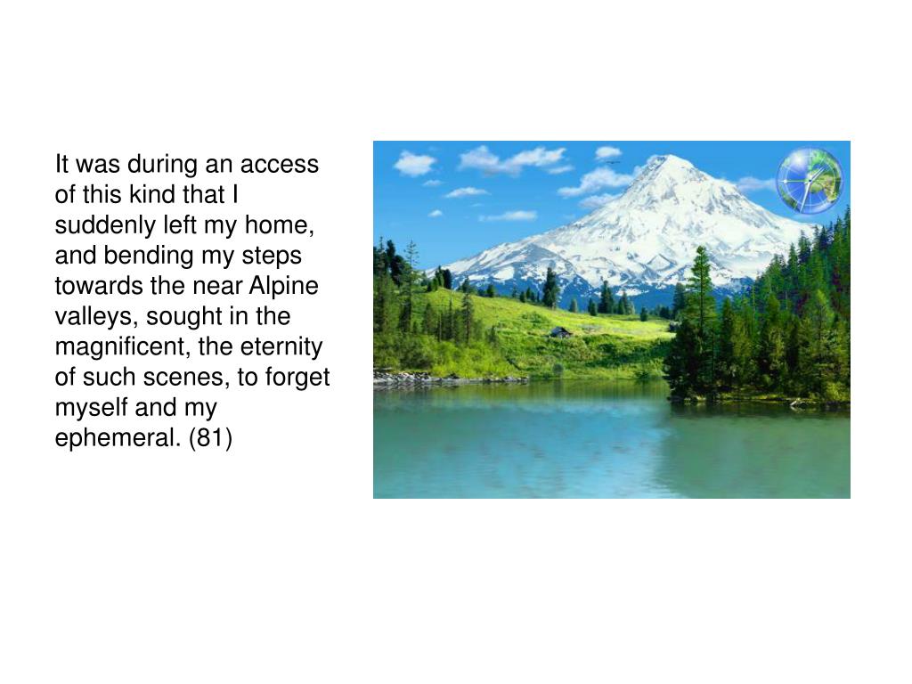 It was during an access of this kind that I suddenly left my home, and bending my steps towards the near Alpine valleys, sought in the magnificent, the eternity of such scenes, to forget myself and my ephemeral. (81)