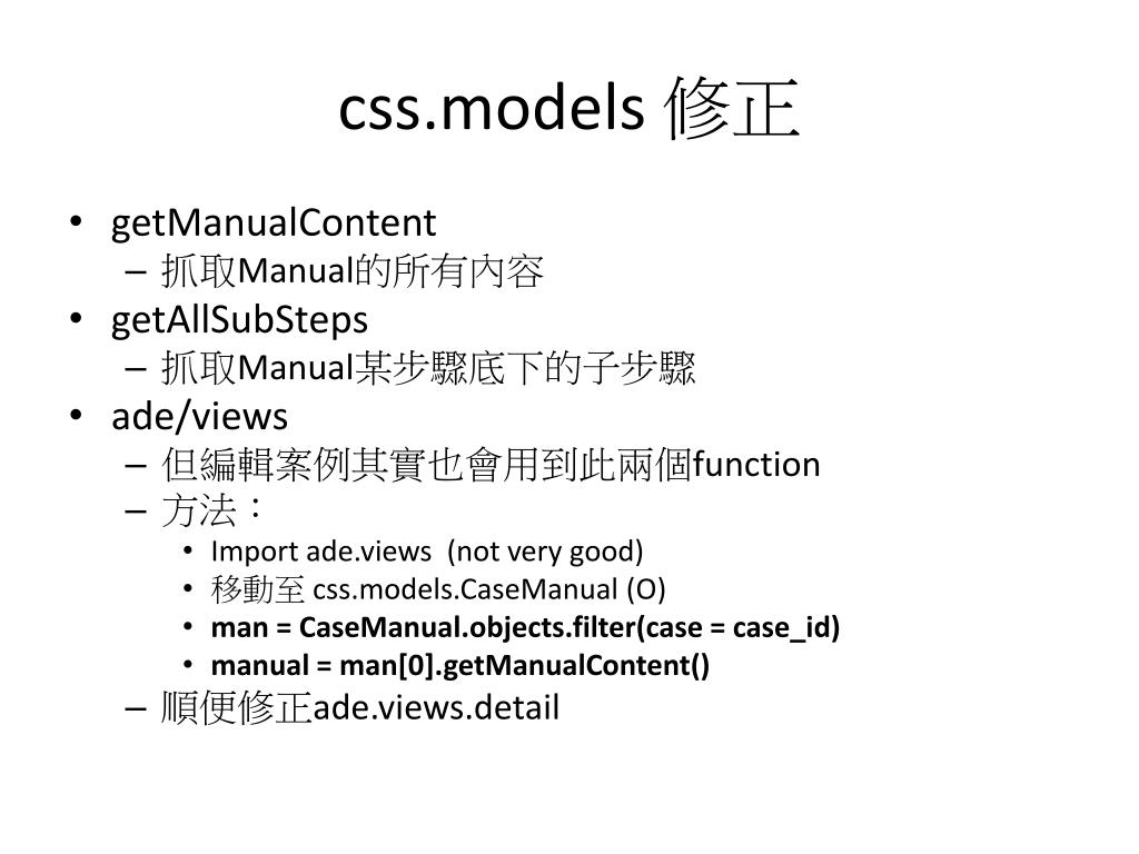 css.models修正 • getManualContent • 抓取Manual的所有內容 • getAllSubSteps • 抓取Manual某步驟底下的子步驟 • ade/views • 但編輯案例其實也會用到此兩個function • 方法: • Import ade.views (not very good) • 移動至 css.models.CaseManual (O) • man=CaseManual.objects.filter(case=case_id) • manual=man[0].getManualContent() • 順便修正ade.views.detail
