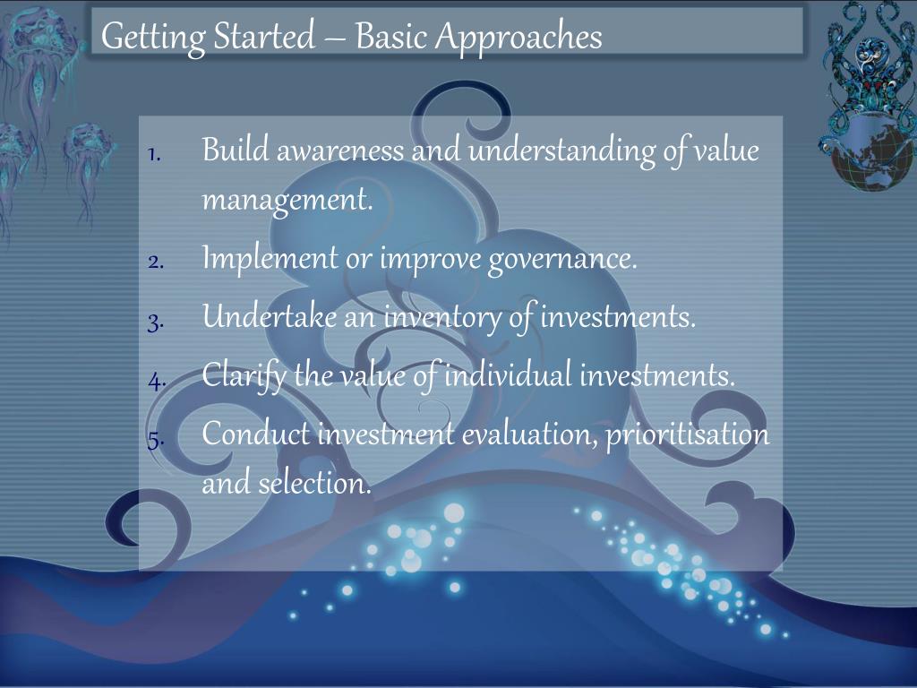 Getting Started – Basic Approaches • Build awareness and understanding of value management. • Implement or improve governance. • Undertake an inventory of investments. • Clarify the value of individual investments. • Conduct investment evaluation, prioritisation and selection.
