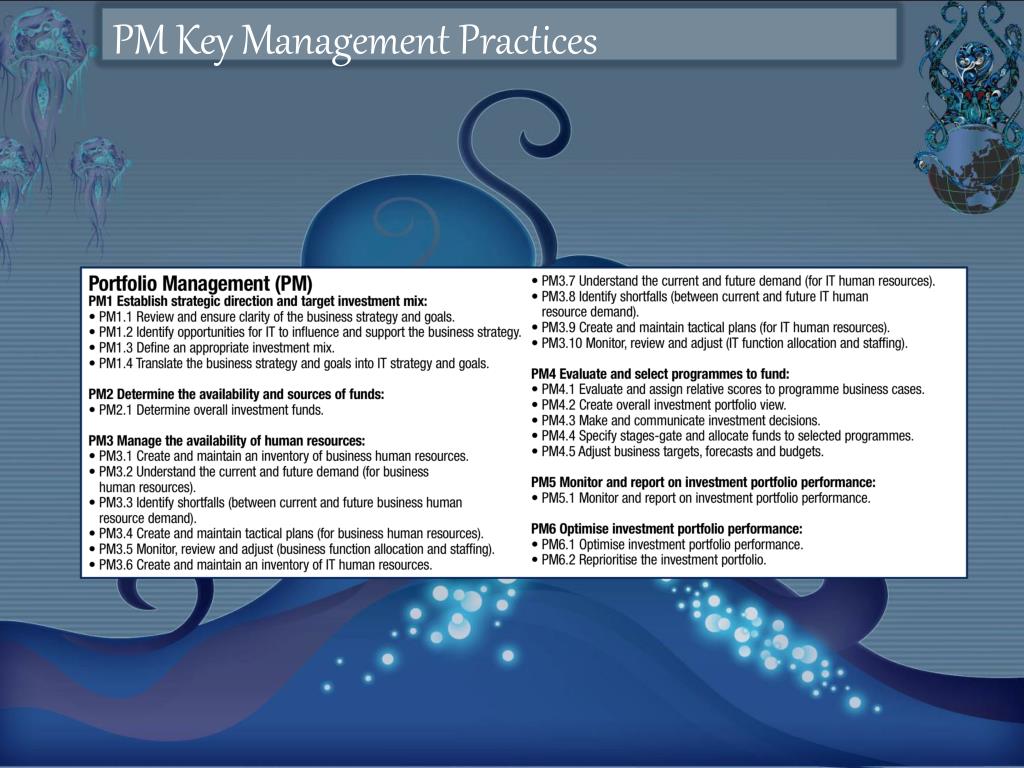 How Val IT Works Establish informed and committed leadership. Define and implement processes. Define portfolio characteristics. Value Governance(VG) Align and integrate value management with enterprise financial planning. Establish effective governance monitoring. Continuously improve value management practices. Establish strategic direction and target investment mix. Determine the availability and sources of funds. Manage the availability of human resources. Portfolio Management(PM) Evaluate and select programmes to fund. Monitor and report on investment portfolio performance. Optimise investment portfolio performance. Develop and evaluate the initial program concept business case. Understand the candidate programme and implementation options. Develop the programme plan. Develop full life cycle costs and benefits. Develop the detailed candidate programme business case. Launch and manage the programme. Update operational IT portfolios. Investment Management(IM) Update the business case. Monitor and report on the programme. Retire the programme.