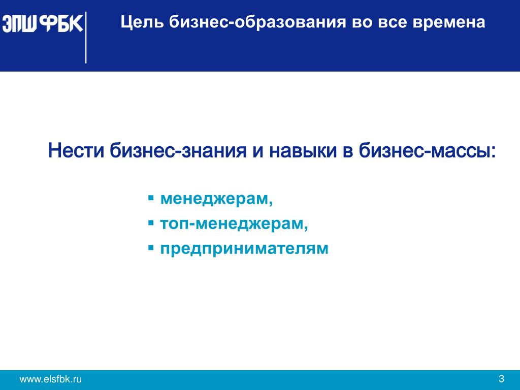 Цель бизнес-образования во все времена Нести бизнес-знания и навыки в бизнес-массы: • менеджерам, • топ-менеджерам, • предпринимателям
