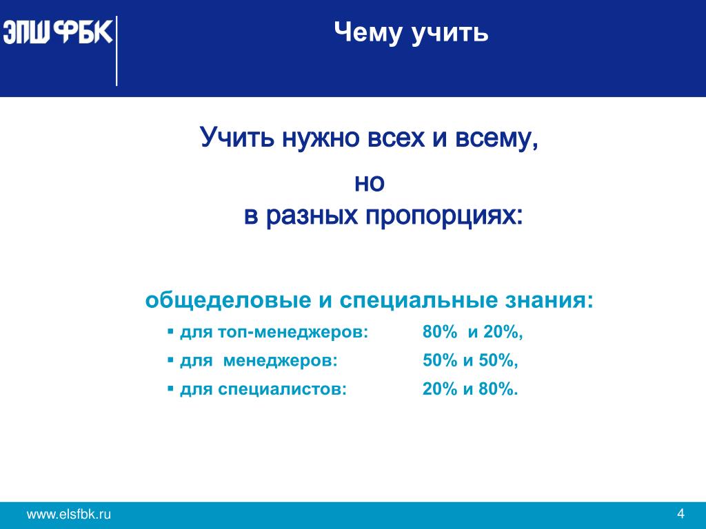 Чему учить Учить нужно всех и всему, но в разных пропорциях: общеделовые и специальные знания: • для топ-менеджеров: 80% и 20%, • для менеджеров: 50% и 50%, • для специалистов: 20% и 80%.