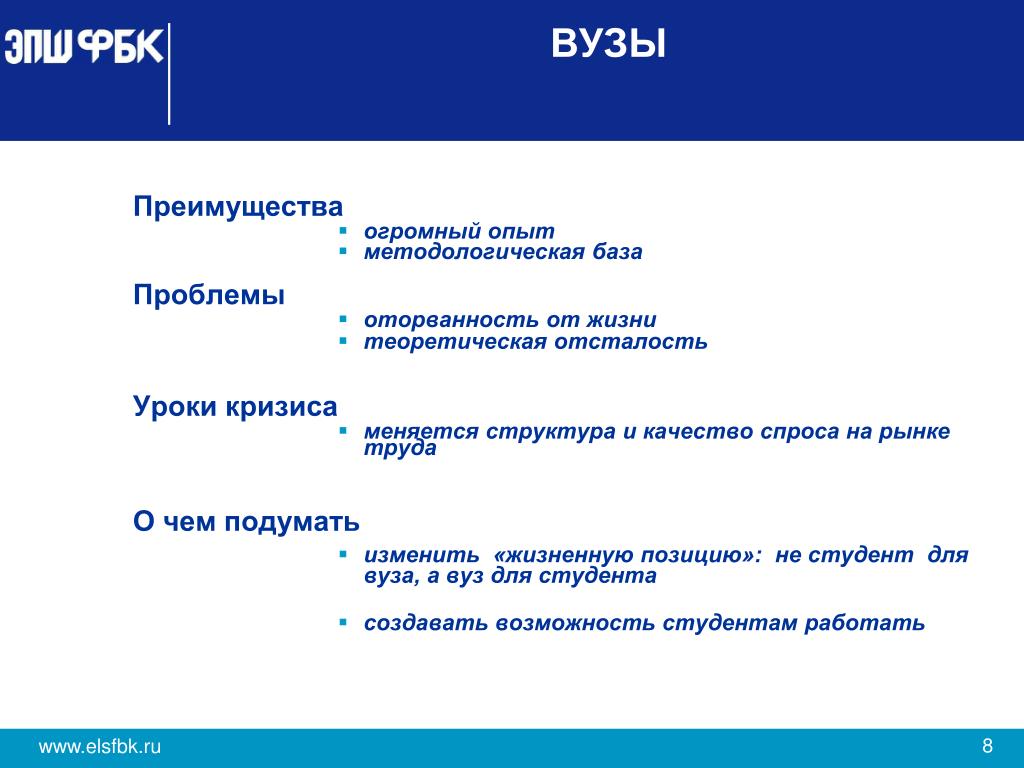 ВУЗЫ Преимущества • огромный опыт • методологическая база Проблемы • оторванность от жизни • теоретическая отсталость Уроки кризиса • меняется структура и качество спроса на рынке труда О чем подумать • изменить «жизненную позицию»: не студент для вуза, а вуз для студента • создавать возможность студентам работать