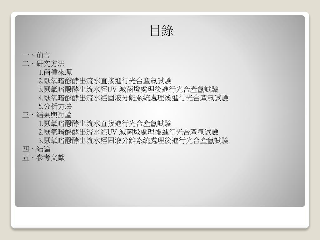 結合厭氧菌和紫色不含硫光合細菌產氫之研究. 班級:四環四 A 學號: 4960N010 姓名:李奕賢. 目錄.