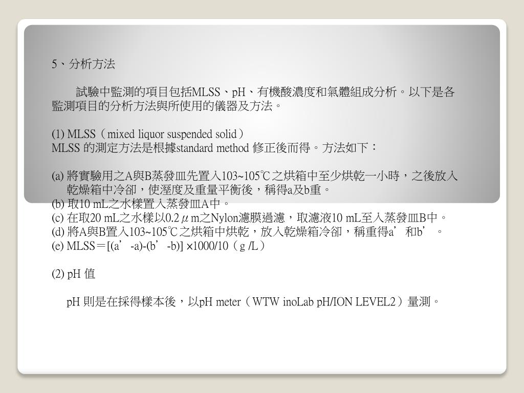 5、分析方法 試驗中監測的項目包括MLSS、pH、有機酸濃度和氣體組成分析。以下是各 監測項目的分析方法與所使用的儀器及方法。 (1) MLSS(mixed liquor suspended solid) MLSS 的測定方法是根據standard method 修正後而得。方法如下: (a) 將實驗用之A與B蒸發皿先置入103~105℃之烘箱中至少烘乾一小時,之後放入 乾燥箱中冷卻,使溼度及重量平衡後,稱得a及b重。 (b) 取10 mL之水樣置入蒸發皿A中。 (c) 在取20 mL之水樣以0.2μm之Nylon濾膜過濾,取濾液10 mL至入蒸發皿B中。 (d) 將A與B置入103~105℃之烘箱中烘乾,放入乾燥箱冷卻,稱重得a’和b’。 (e) MLSS=[(a’-a)-(b’-b)] ×1000/10(g /L) (2) pH 值 pH 則是在採得樣本後,以pH meter(WTW inoLab pH/ION LEVEL2)量測。
