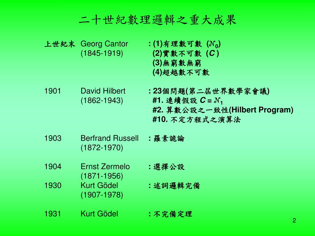 上世紀末19011903190419301931 Georg Cantor(1845-1919)David Hilbert(1862-1943)Berfrand Russell(1872-1970)Ernst Zermelo(1871-1956)Kurt Gödel(1907-1978)Kurt Gödel : (1)有理數可數 (N0) (2)實數不可數 (C ) (3)無窮數無窮(4)超越數不可數: 23個問題(第二屆世界數學家會議) #1. 連續假設 C=N1 #2. 算數公設之一致性(Hilbert Program) #10. 不定方程式之演算法: 羅素詭論: 選擇公設: 述詞邏輯完備: 不完備定理 二十世紀數理邏輯之重大成果