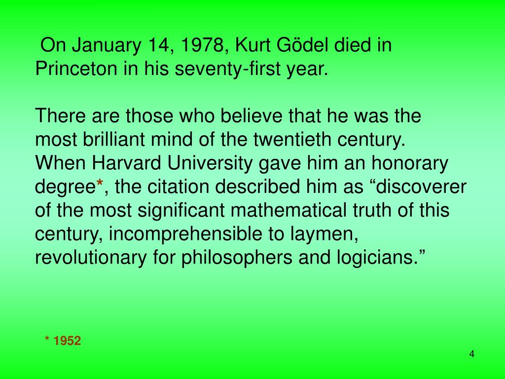 On January 14, 1978, Kurt Gödel died in Princeton in his seventy-first year.There are those who believe that he was the most brilliant mind of the twentieth century. When Harvard University gave him an honorary degree*, the citation described him as “discoverer of the most significant mathematical truth of this century, incomprehensible to laymen, revolutionary for philosophers and logicians.” *1952