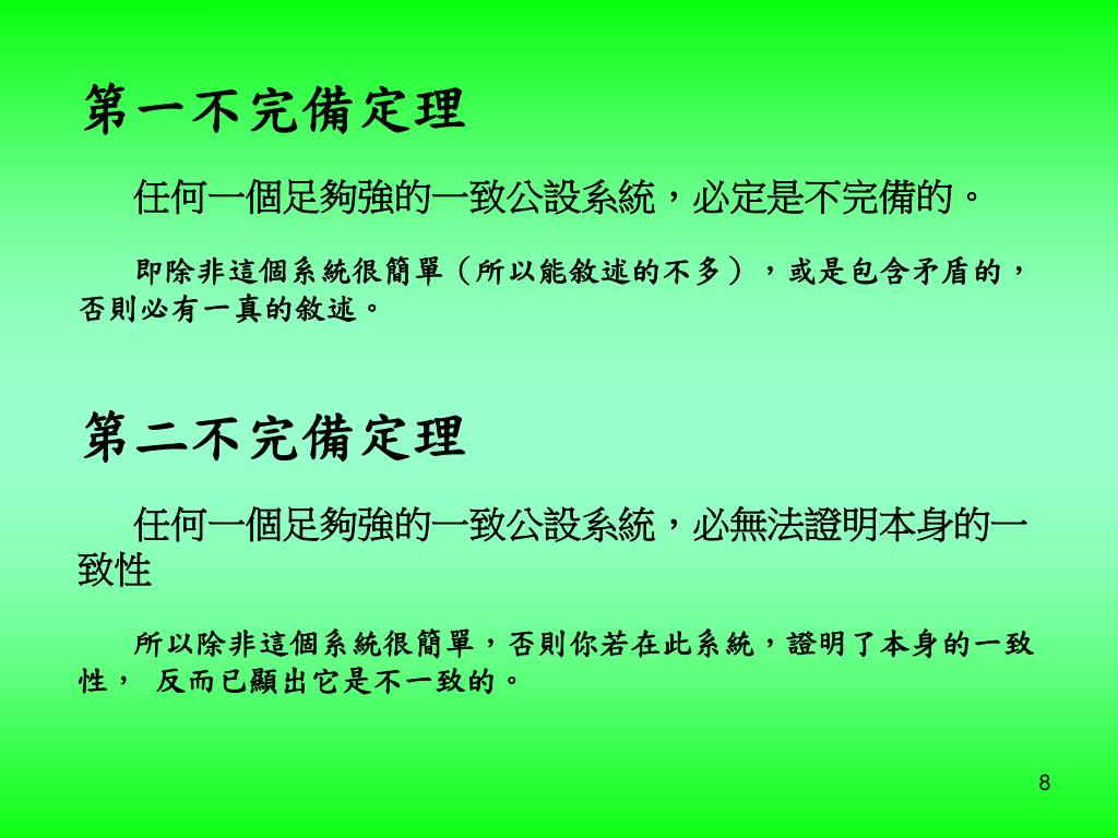 第一不完備定理任何一個足夠強的一致公設系統,必定是不完備的。即除非這個系統很簡單(所以能敘述的不多),或是包含矛盾的,否則必有一真的敘述。第二不完備定理任何一個足夠強的一致公設系統,必無法證明本身的一致性第一不完備定理任何一個足夠強的一致公設系統,必定是不完備的。即除非這個系統很簡單(所以能敘述的不多),或是包含矛盾的,否則必有一真的敘述。第二不完備定理任何一個足夠強的一致公設系統,必無法證明本身的一致性 所以除非這個系統很簡單,否則你若在此系統,證明了本身的一致性, 反而已顯出它是不一致的。