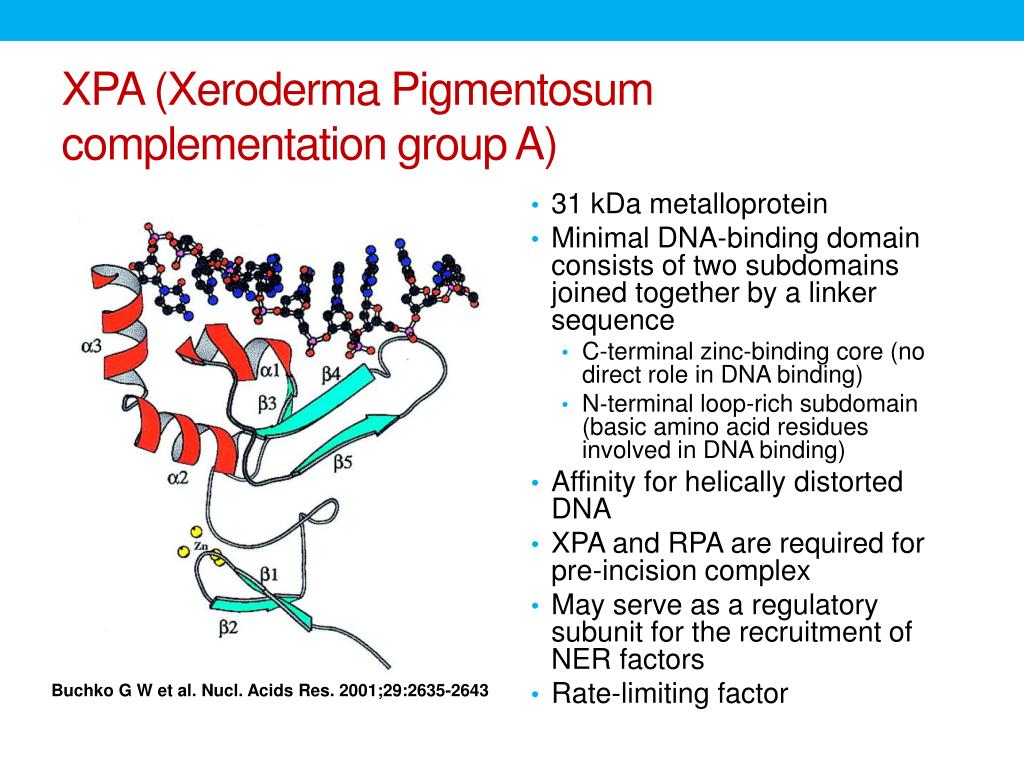 XPA (XerodermaPigmentosum complementation group A) • 31 kDametalloprotein • Minimal DNA-binding domain consists of two subdomains joined together by a linker sequence • C-terminal zinc-binding core (no direct role in DNA binding) • N‐terminal loop-rich subdomain (basic amino acid residues involved in DNA binding) • Affinity for helically distorted DNA • XPA and RPA are required for pre-incision complex • May serve as a regulatory subunit for the recruitment of NER factors • Rate-limiting factor Buchko G W et al. Nucl. Acids Res. 2001;29:2635-2643