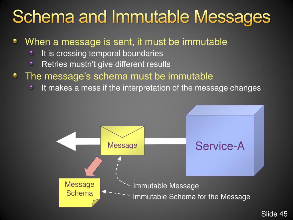 Service-A Message Schema Immutable Message Immutable Schema for the Message Message Schema and Immutable Messages • When a message is sent, it must be immutable • It is crossing temporal boundaries • Retries mustn’t give different results • The message’s schema must be immutable • It makes a mess if the interpretation of the message changes Slide 45