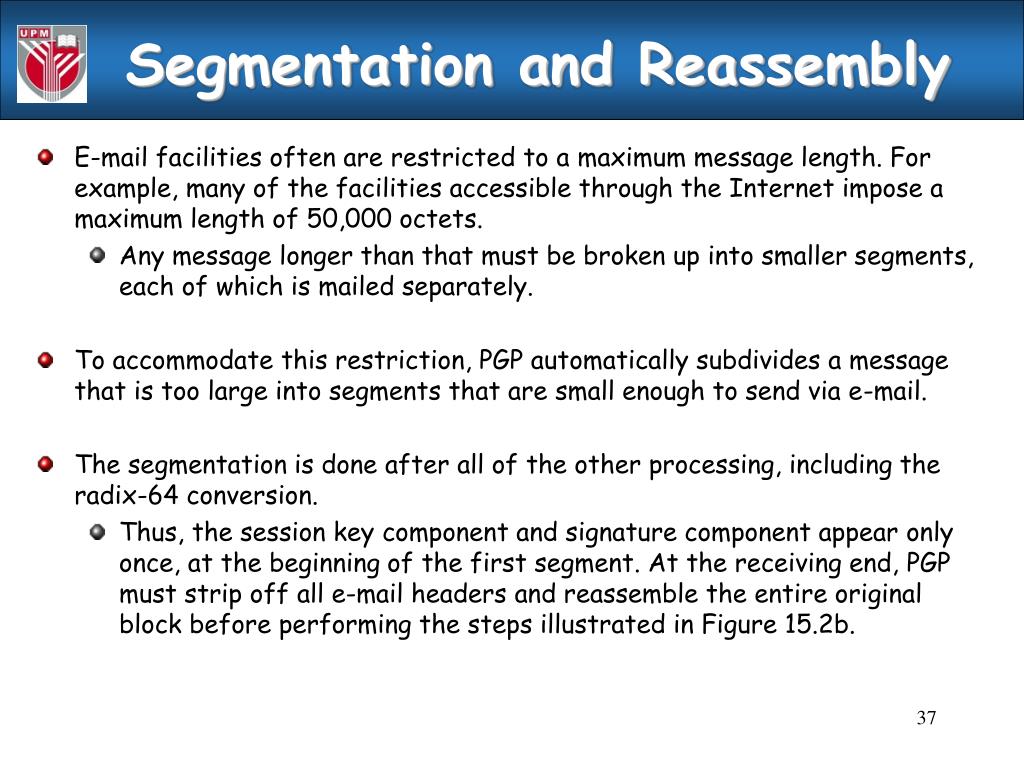 Segmentation and Reassembly • E-mail facilities often are restricted to a maximum message length. For example, many of the facilities accessible through the Internet impose a maximum length of 50,000 octets. • Any message longer than that must be broken up into smaller segments, each of which is mailed separately. • To accommodate this restriction, PGP automatically subdivides a message that is too large into segments that are small enough to send via e-mail. • The segmentation is done after all of the other processing, including the radix-64 conversion. • Thus, the session key component and signature component appear only once, at the beginning of the first segment. At the receiving end, PGP must strip off all e-mail headers and reassemble the entire original block before performing the steps illustrated in Figure 15.2b.