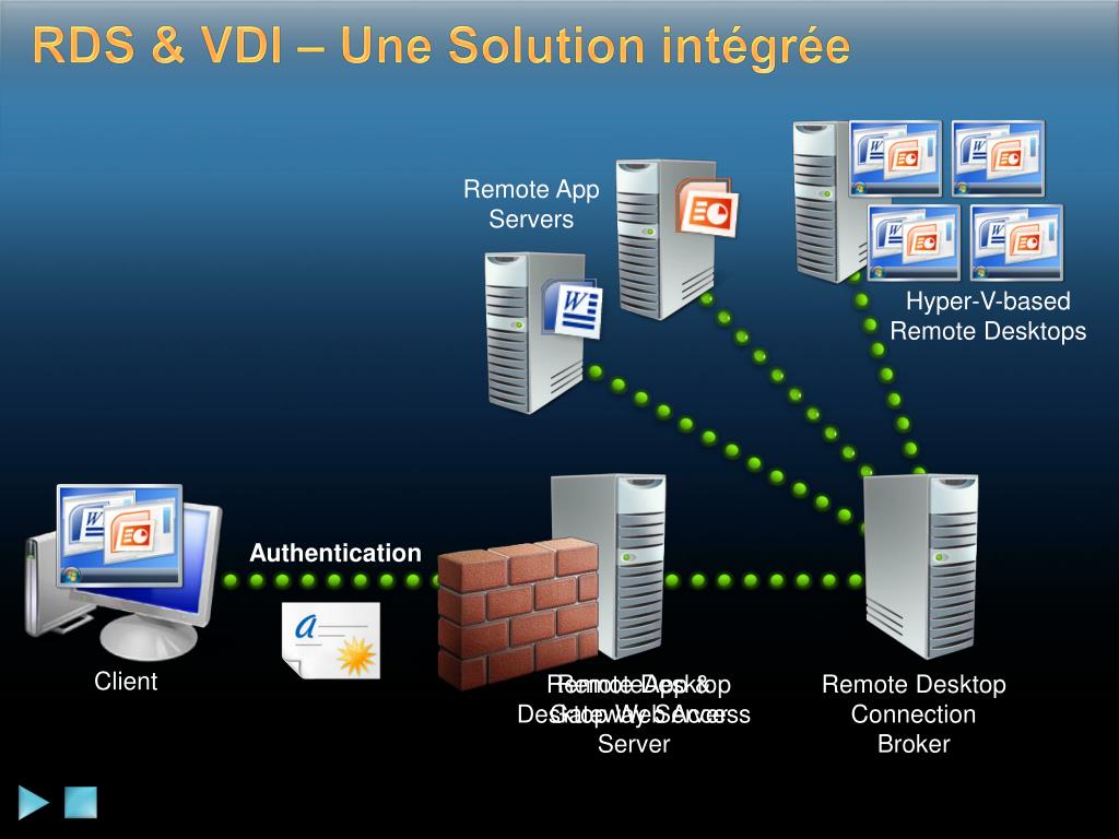 RDS & VDI – Une Solution intégrée Remote App Servers Hyper-V-based Remote Desktops Authentication Client RemoteApp & Desktop Web Access Server Remote Desktop Gateway Server Remote Desktop Connection Broker