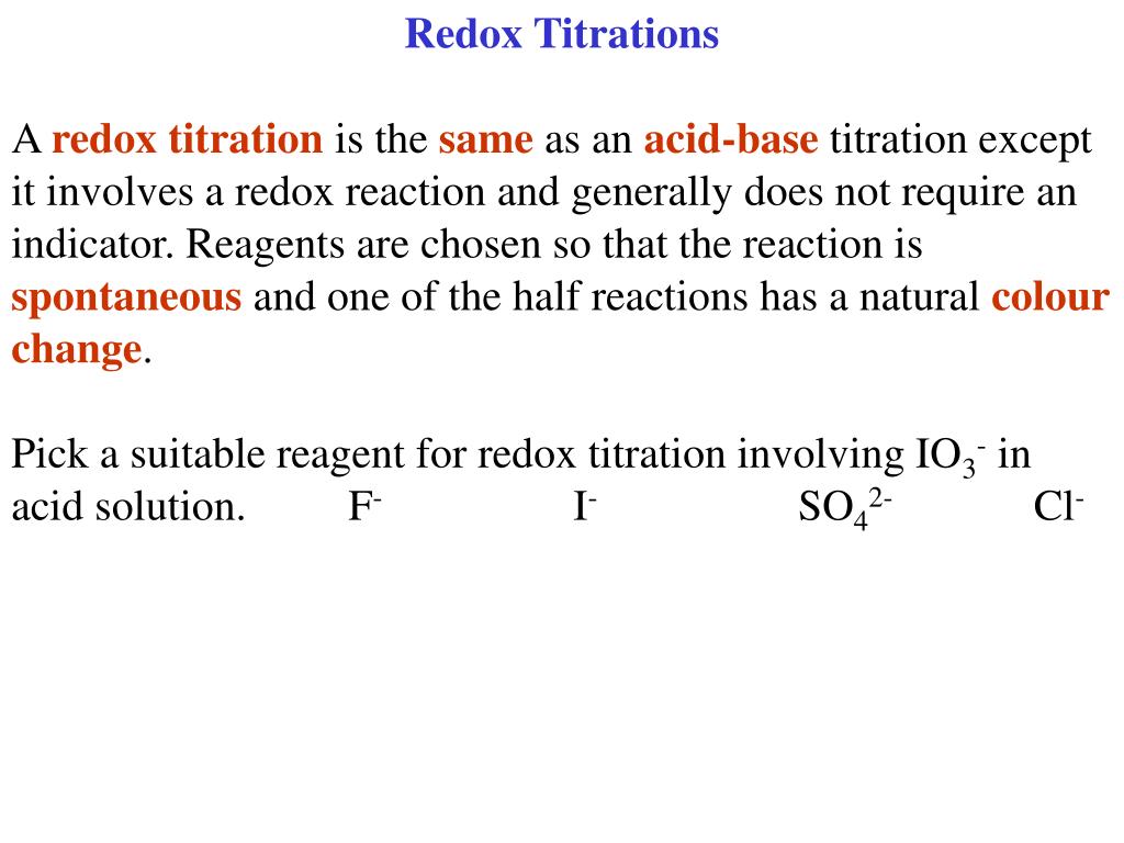 Redox Titrations A redox titration is the same as an acid-base titration except it involves a redox reaction and generally does not require an indicator. Reagents are chosen so that the reaction is spontaneousand one of the half reactions has a natural colour change. Pick a suitable reagent for redox titration involving IO3- in acid solution. F-I- SO42- Cl-