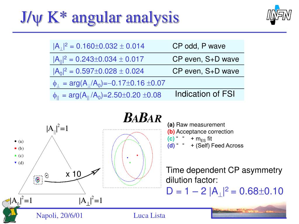 J/ K* angular analysis Indication of FSI (a) Raw measurement (b) Acceptance correction (c) “ “ + mES fit (d) “ “ + (Self) Feed Across Time dependent CP asymmetry dilution factor: D =1 – 2|A|2 = 0.680.10 Luca Lista