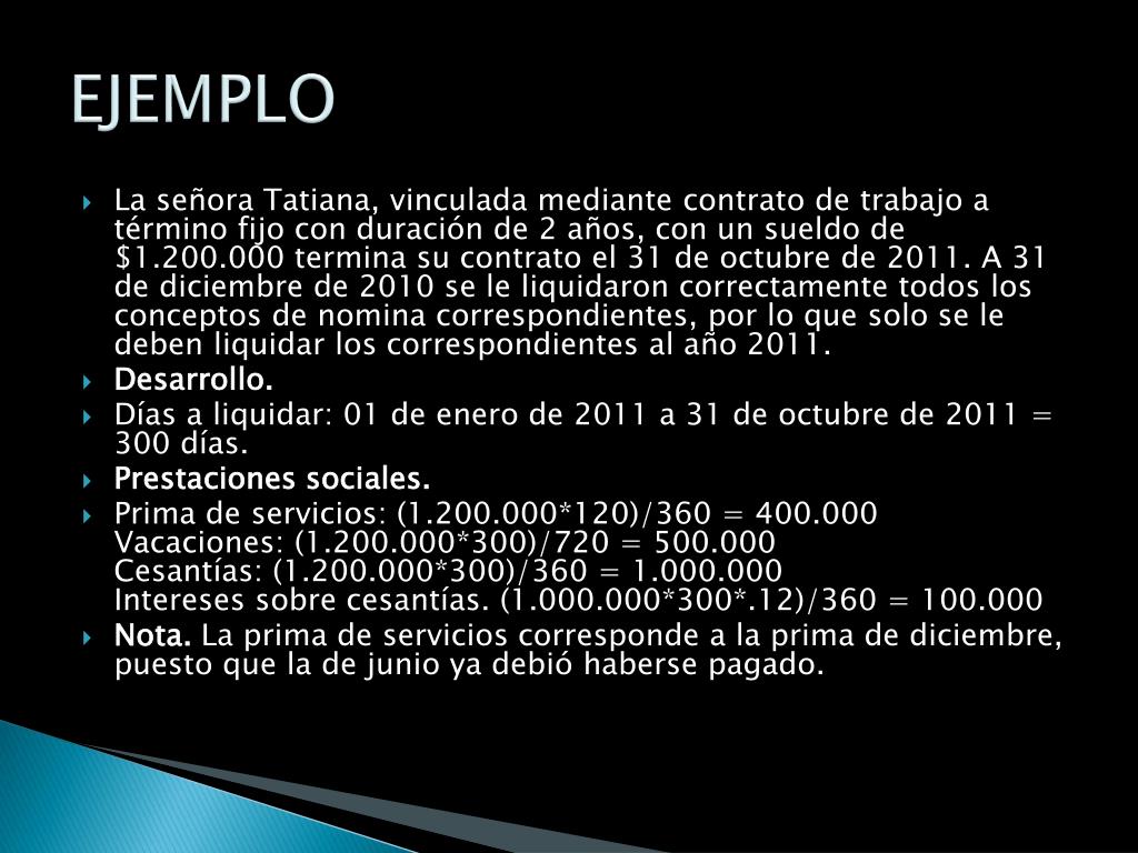 EJEMPLO • La señora Tatiana, vinculada mediante contrato de trabajo a término fijo con duración de 2 años, con un sueldo de $1.200.000 termina su contrato el 31 de octubre de 2011. A 31 de diciembre de 2010 se le liquidaron correctamente todos los conceptos de nomina correspondientes, por lo que solo se le deben liquidar los correspondientes al año 2011. • Desarrollo. • Días a liquidar: 01 de enero de 2011 a 31 de octubre de 2011 = 300 días. • Prestaciones sociales. • Prima de servicios: (1.200.000*120)/360 = 400.000Vacaciones: (1.200.000*300)/720 = 500.000Cesantías: (1.200.000*300)/360 = 1.000.000Intereses sobre cesantías. (1.000.000*300*.12)/360 = 100.000 • Nota. La prima de servicios corresponde a la prima de diciembre, puesto que la de junio ya debió haberse pagado.