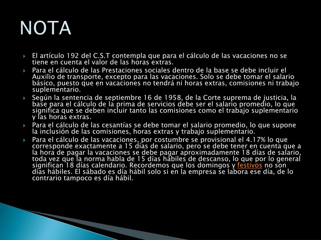 NOTA • El artículo 192 del C.S.T contempla que para el cálculo de las vacaciones no se tiene en cuenta el valor de las horas extras. • Para el cálculo de las Prestaciones sociales dentro de la base se debe incluir el Auxilio de transporte, excepto para las vacaciones. Solo se debe tomar el salario básico, puesto que en vacaciones no tendrá ni horas extras, comisiones ni trabajo suplementario. • Según la sentencia de septiembre 16 de 1958, de la Corte suprema de justicia, la base para el cálculo de la prima de servicios debe ser el salario promedio, lo que significa que se deben incluir tanto las comisiones como el trabajo suplementario y las horas extras. • Para el cálculo de las cesantías se debe tomar el salario promedio, lo que supone la inclusión de las comisiones, horas extras y trabajo suplementario. • Para el cálculo de las vacaciones, por costumbre se provisional el 4.17% lo que corresponde exactamente a 15 días de salario, pero se debe tener en cuenta que a la hora de pagar la vacaciones se debe pagar aproximadamente 18 días de salario, toda vez que la norma habla de 15 días hábiles de descanso, lo que por lo general significan 18 días calendario. Recordemos que los domingos y festivos no son días hábiles. El sábado es día hábil solo si en la empresa se labora ese día, de lo contrario tampoco es día hábil.