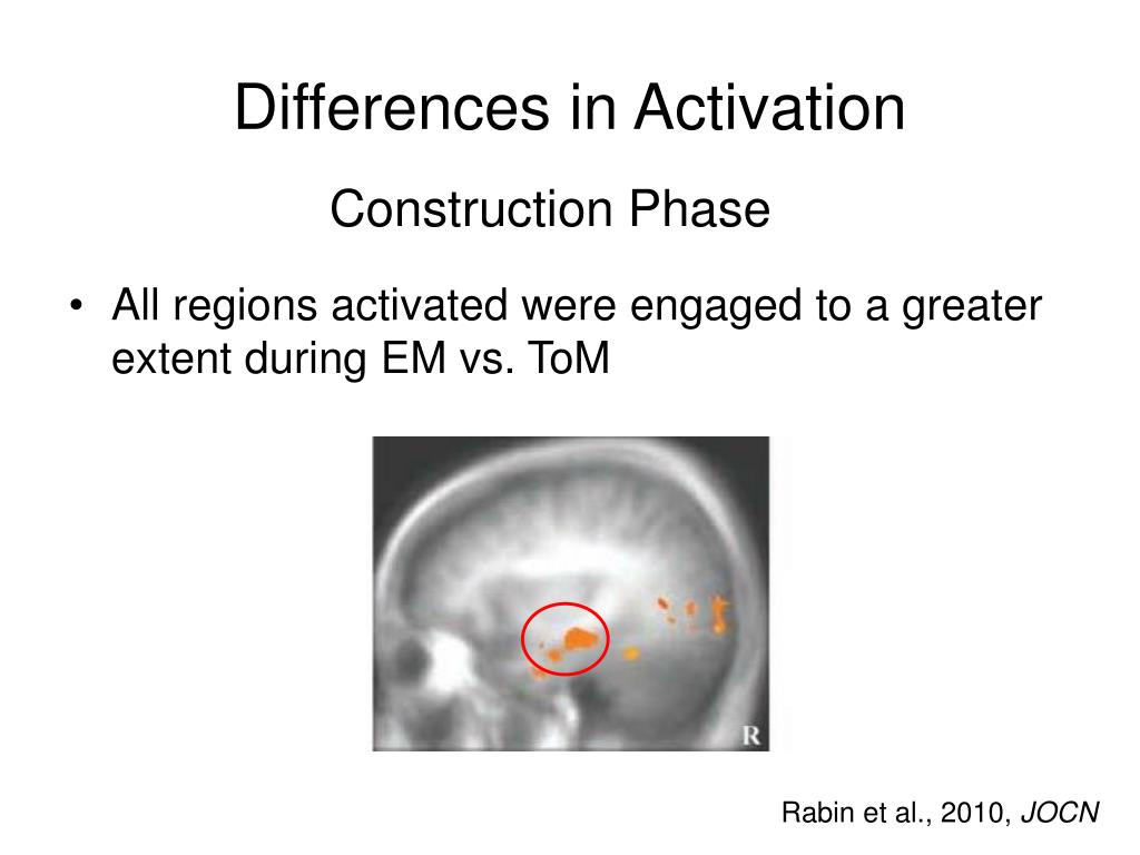 Differences in Activation Construction Phase • All regions activated were engaged to a greater extent during EM vs. ToM Rabin et al., 2010, JOCN