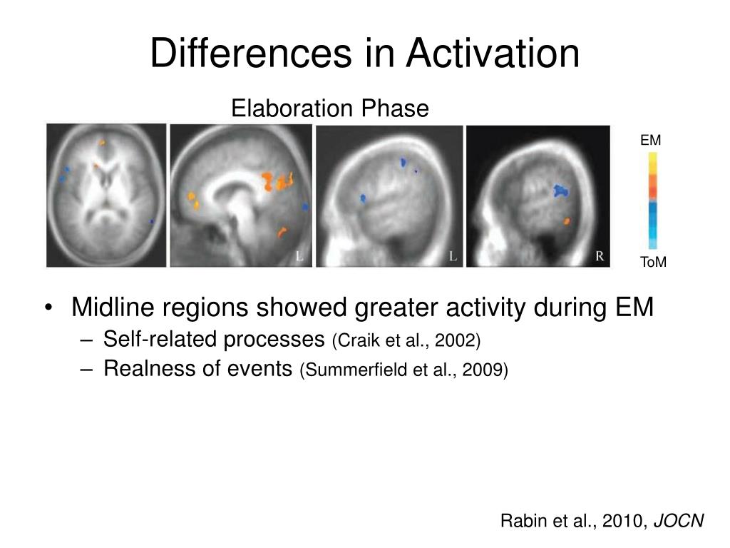 Differences in Activation Elaboration Phase EM • Midline regions showed greater activity during EM • Self-related processes (Craik et al., 2002) • Realness of events (Summerfield et al., 2009) • Lateral regions showed greater activity during ToM • Involved in semantic memory (Martin & Chao, 2001) ToM Rabin et al., 2010, JOCN