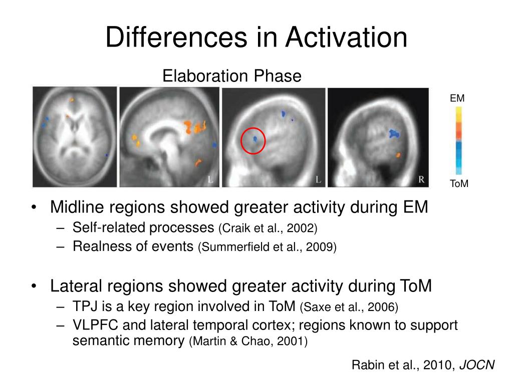 Differences in Activation Elaboration Phase EM • Midline regions showed greater activity during EM • Self-related processes (Craik et al., 2002) • Realness of events (Summerfield et al., 2009) • Lateral regions showed greater activity during ToM • TPJ is a key region involved in ToM(Saxe et al., 2006) • VLPFC and lateral temporal cortex; regions known to support semantic memory (Martin & Chao, 2001) ToM Rabin et al., 2010, JOCN