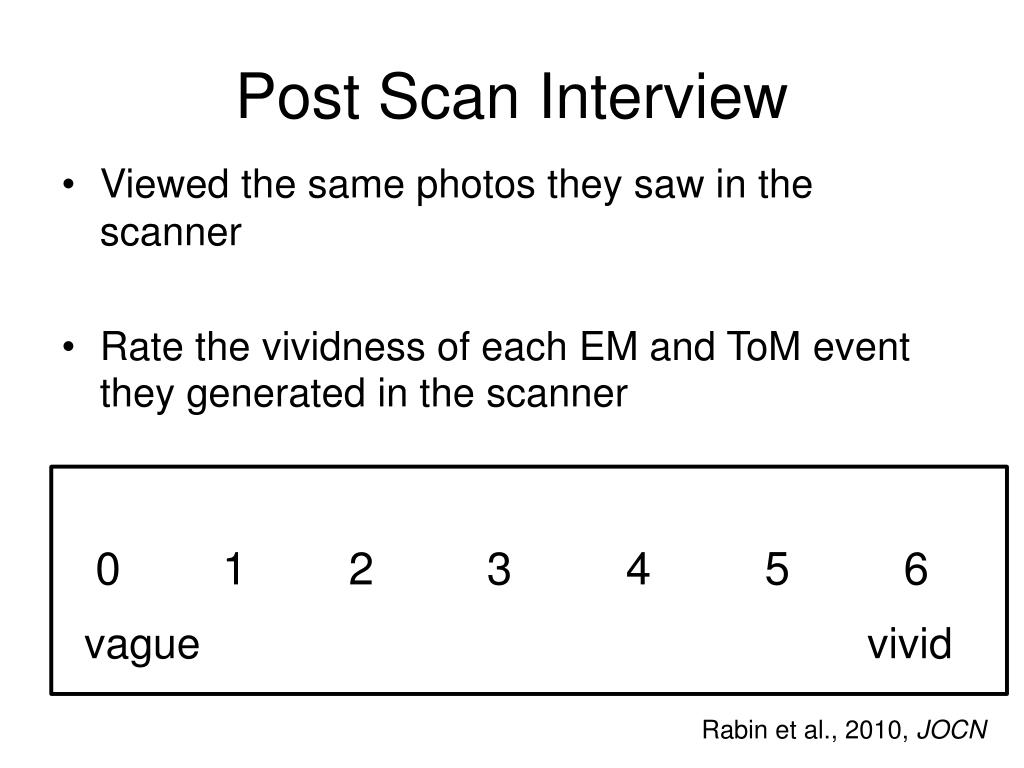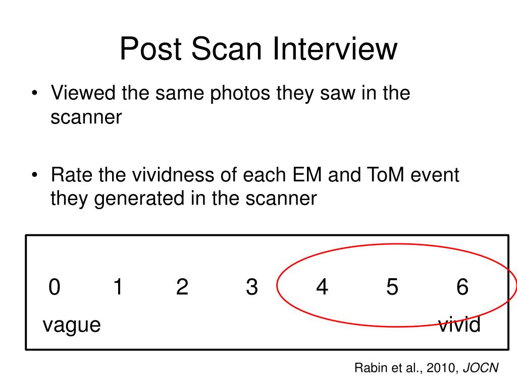 Post Scan Interview Viewed the same photos they saw in the scanner Rate the vividness of each EM and ToMevent they generated in the scanner 0 1 2 3 4 5 6 vague vivid Rabin et al., 2010, JOCN
