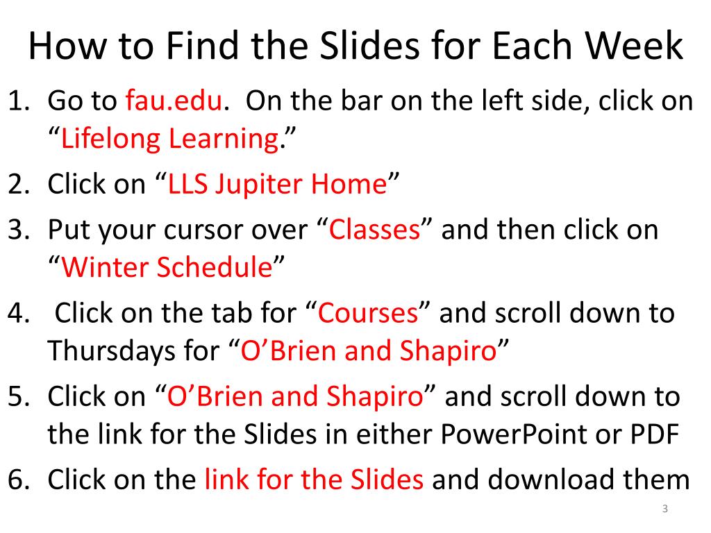 How to Find the Slides for Each Week • Go to fau.edu. On the bar on the left side, click on “Lifelong Learning.” • Click on “LLS Jupiter Home” • Put your cursor over “Classes” and then click on “Winter Schedule” • Click on the tab for “Courses” and scroll down to Thursdays for “O’Brien and Shapiro” • Click on “O’Brien and Shapiro” and scroll down to the link for the Slides in either PowerPoint or PDF • Click on the link for the Slides and download them