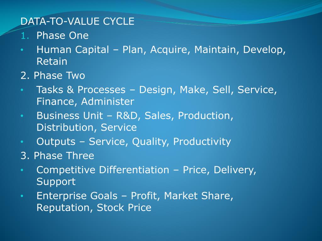 DATA-TO-VALUE CYCLE Phase One Human Capital – Plan, Acquire, Maintain, Develop, Retain 2. Phase Two Tasks & Processes – Design, Make, Sell, Service, Finance, Administer Business Unit – R&D, Sales, Production, Distribution, Service Outputs – Service, Quality, Productivity 3. Phase Three Competitive Differentiation – Price, Delivery, Support Enterprise Goals – Profit, Market Share, Reputation, Stock Price