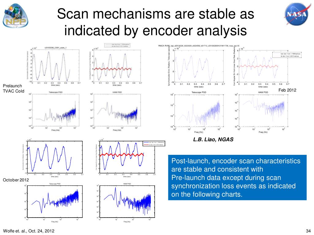 Scan mechanisms are stable as indicated by encoder analysis Post-launch, encoder scan characteristics are stable and consistent with Pre-launch data except during scan synchronization loss events as indicated on the following charts. Wolfe et. al., Oct. 24, 2012