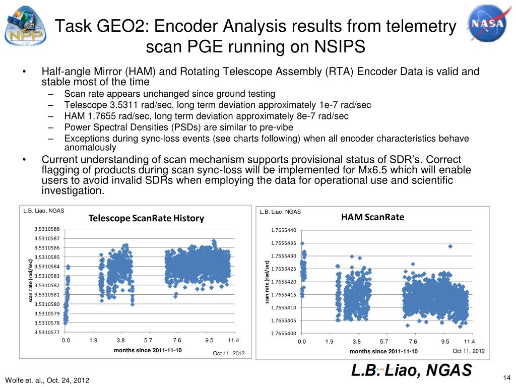 Task GEO2: Encoder Analysis results from telemetry scan PGE running on NSIPS • Half-angle Mirror (HAM) and Rotating Telescope Assembly (RTA) Encoder Data is valid and stable most of the time • Scan rate appears unchanged since ground testing • Telescope 3.5311 rad/sec, long term deviation approximately 1e-7 rad/sec • HAM 1.7655 rad/sec, long term deviation approximately 8e-7 rad/sec • Power Spectral Densities (PSDs) are similar to pre-vibe • Exceptions during sync-loss events (see charts following) when all encoder characteristics behave anomalously • Current understanding of scan mechanism supports provisional status of SDR’s. Correct flagging of products during scan sync-loss will be implemented for Mx6.5 which will enable users to avoid invalid SDRs when employing the data for operational use and scientific investigation. • 0.0 1.9 3.8 5.7 7.6 9.5 11.4 • 0.0 1.9 3.8 5.7 7.6 9.5 11.4 • months since 2011-11-10 • months since 2011-11-10 Wolfe et. al., Oct. 24, 2012