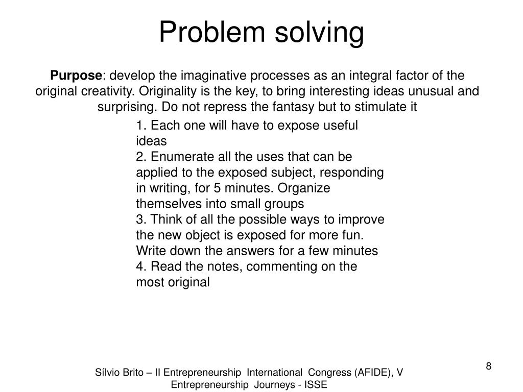 Problem solving Purpose: develop the imaginative processes as an integral factor of the original creativity. Originality is the key, to bring interesting ideas unusual and surprising. Do not repress the fantasy but to stimulate it 1. Each one will have to expose useful ideas2. Enumerate all the uses that can be applied to the exposed subject, responding in writing, for 5 minutes. Organize themselves into small groups3. Think of all the possible ways to improve the new object is exposed for more fun. Write down the answers for a few minutes4. Read the notes, commenting on the most original Sílvio Brito – II Entrepreneurship International Congress (AFIDE), V Entrepreneurship Journeys - ISSE