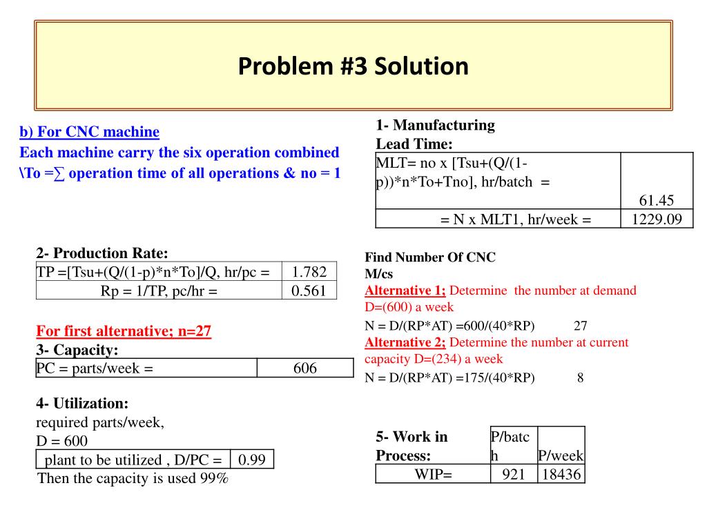 Problem #3 Question 3 A plant having 18 machines produces a part being processed through six machines in batch of 30 parts. 20 batches of parts are launched each week. Average operation time = 30 min., average setup time per machine = 5hr, non-operation time per machine = 12 hr, and scrap rate =3% as mentioned in table 1. Machine and labor cost= 80 SR/hr, raw material cost 300 SR/part, holding cost rate= 35%/year. Determine: a) MLT, WIP, holding cost and part cost b) If the machines are replaced by CNC machines on which operation time = 15 min., setup time per machine =8hr, and non-productive time per machine =8hr, and scrap rate= 1%. Machine and operation cost = 150 SR/hr and material cost is the same. What are the number of CNC machines. Then determine MLT, WIP, holding cost and part cost.