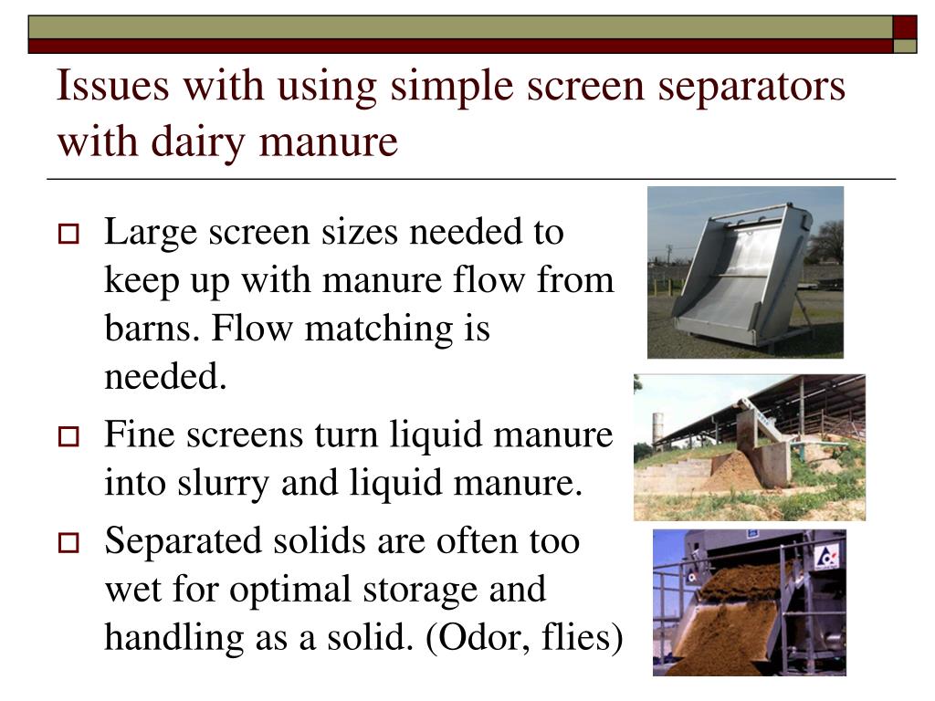 Issues with using simple screen separators with dairy manure • Large screen sizes needed to keep up with manure flow from barns. Flow matching is needed. • Fine screens turn liquid manure into slurry and liquid manure. • Separated solids are often too wet for optimal storage and handling as a solid. (Odor, flies)