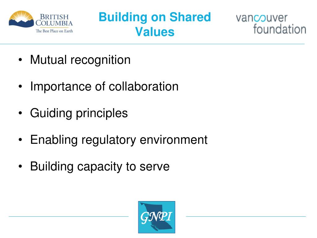 Building on Shared Values • Mutual recognition • Importance of collaboration • Guiding principles • Enabling regulatory environment • Building capacity to serve