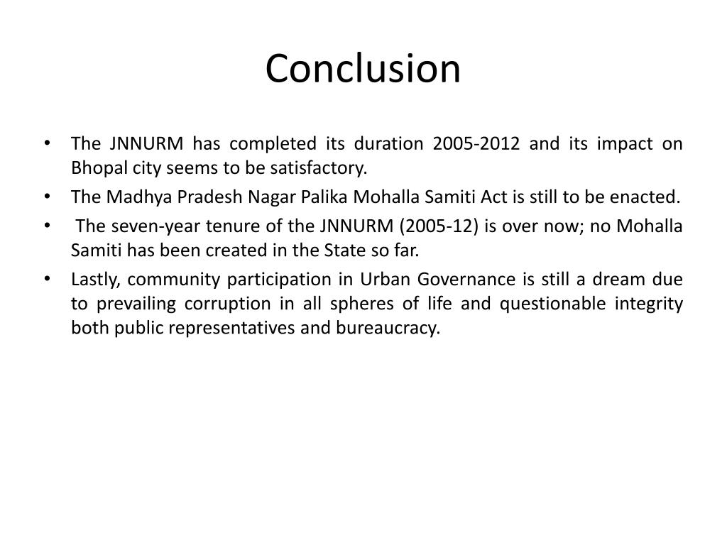 Conclusion • The JNNURM has completed its duration 2005-2012 and its impact on Bhopal city seems to be satisfactory. • The Madhya Pradesh Nagar Palika Mohalla Samiti Act is still to be enacted. • The seven-year tenure of the JNNURM (2005-12) is over now; no Mohalla Samiti has been created in the State so far. • Lastly, community participation in Urban Governance is still a dream due to prevailing corruption in all spheres of life and questionable integrity both public representatives and bureaucracy.