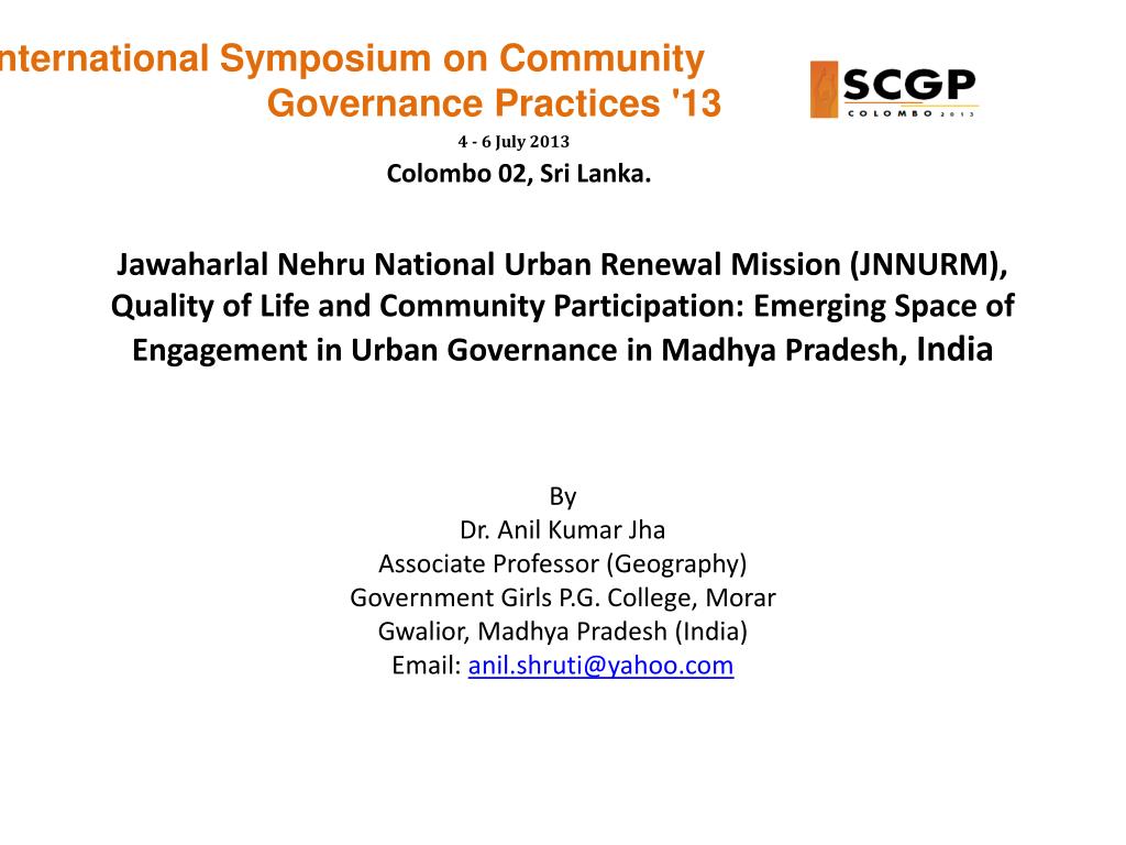 International Symposium on Community Governance Practices '13 4 - 6 July 2013 Colombo 02, Sri Lanka. Jawaharlal Nehru National Urban Renewal Mission (JNNURM), Quality of Life and Community Participation: Emerging Space of Engagement in Urban Governance in Madhya Pradesh, India By Dr. Anil Kumar Jha Associate Professor (Geography) Government Girls P.G. College, Morar Gwalior, Madhya Pradesh (India) Email: anil.shruti@yahoo.com