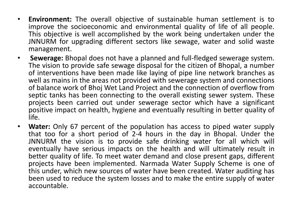 Environment: The overall objective of sustainable human settlement is to improve the socioeconomic and environmental quality of life of all people. This objective is well accomplished by the work being undertaken under the JNNURM for upgrading different sectors like sewage, water and solid waste management. • Sewerage: Bhopal does not have a planned and full-fledged sewerage system. The vision to provide safe sewage disposal for the citizen of Bhopal, a number of interventions have been made like laying of pipe line network branches as well as mains in the areas not provided with sewerage system and connections of balance work of Bhoj Wet Land Project and the connection of overflow from septic tanks has been connecting to the overall existing sewer system. These projects been carried out under sewerage sector which have a significant positive impact on health, hygiene and eventually resulting in better quality of life. • Water:Only 67 percent of the population has access to piped water supply that too for a short period of 2-4 hours in the day in Bhopal. Under the JNNURM the vision is to provide safe drinking water for all which will eventually have serious impacts on the health and will ultimately result in better quality of life. To meet water demand and close present gaps, different projects have been implemented. Narmada Water Supply Scheme is one of this under, which new sources of water have been created. Water auditing has been used to reduce the system losses and to make the entire supply of water accountable.