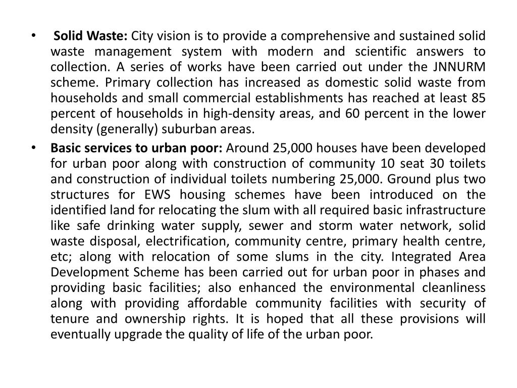Solid Waste: City vision is to provide a comprehensive and sustained solid waste management system with modern and scientific answers to collection. A series of works have been carried out under the JNNURM scheme. Primary collection has increased as domestic solid waste from households and small commercial establishments has reached at least 85 percent of households in high-density areas, and 60 percent in the lower density (generally) suburban areas. • Basic services to urban poor: Around 25,000 houses have been developed for urban poor along with construction of community 10 seat 30 toilets and construction of individual toilets numbering 25,000. Ground plus two structures for EWS housing schemes have been introduced on the identified land for relocating the slum with all required basic infrastructure like safe drinking water supply, sewer and storm water network, solid waste disposal, electrification, community centre, primary health centre, etc; along with relocation of some slums in the city. Integrated Area Development Scheme has been carried out for urban poor in phases and providing basic facilities; also enhanced the environmental cleanliness along with providing affordable community facilities with security of tenure and ownership rights. It is hoped that all these provisions will eventually upgrade the quality of life of the urban poor.