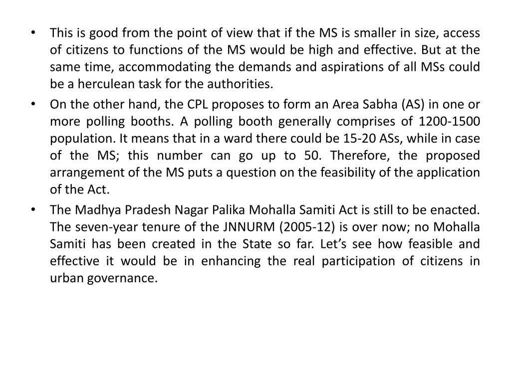 This is good from the point of view that if the MS is smaller in size, access of citizens to functions of the MS would be high and effective. But at the same time,accommodating the demands and aspirations of all MSs could be a herculean task for the authorities. • On the other hand, the CPL proposes to form an Area Sabha (AS) in one or more polling booths. A polling booth generally comprises of 1200-1500 population. It means that in a ward there could be 15-20 ASs, while in case of the MS; this number can go up to 50. Therefore, the proposed arrangement of the MS puts a question on the feasibility of the application of the Act. • The Madhya Pradesh Nagar Palika Mohalla Samiti Act is still to be enacted. The seven-year tenure of the JNNURM (2005-12) is over now; no Mohalla Samiti has been created in the State so far. Let’s see how feasible and effective it would be in enhancing the real participation of citizens in urban governance.
