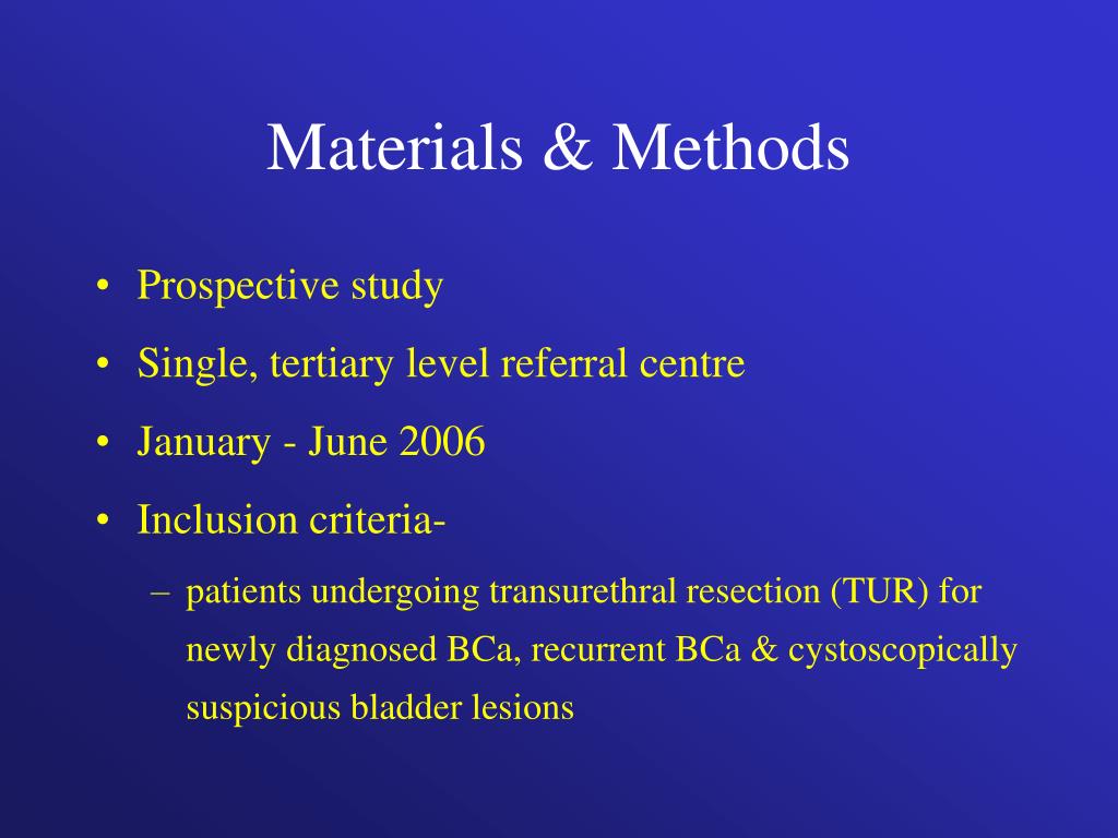 Materials & Methods • Prospective study • Single, tertiary level referral centre • January - June 2006 • Inclusion criteria- • patients undergoing transurethral resection (TUR) for newly diagnosed BCa, recurrent BCa & cystoscopically suspicious bladder lesions